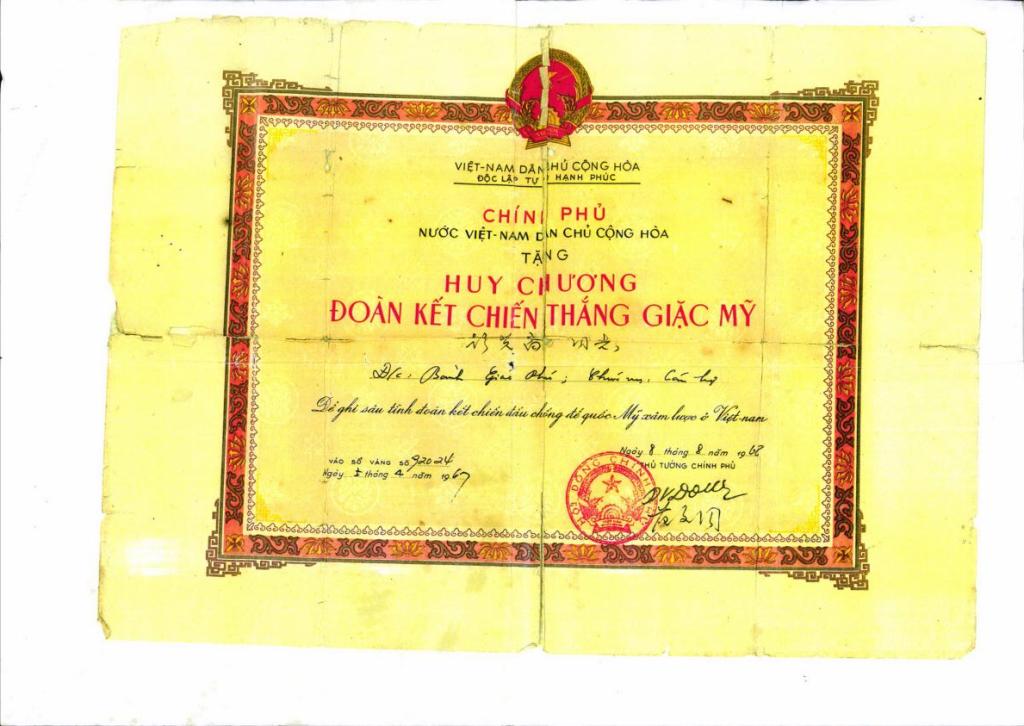 (档案馆馆藏1968年彭觉富援助越南公路建设 获颁时任越南总理范文同签署的嘉奖证书)