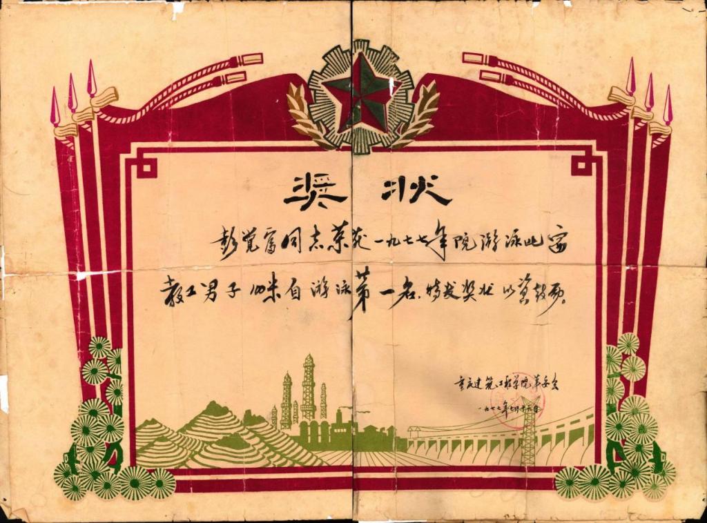 这张教工游泳比赛自游泳的一等奖的奖状也是彭觉富不服输,敢争先的鲜活证明,珍藏至今。和这张奖状一同收藏的还有1990重庆市政府授予的科学技术进步二等奖。交大老师们积极参与技术革新,彭觉富和他的同事们从上世纪80年代开始就承担彭水乌江大桥改建加固在内的多项工程,交大在这一领域具备不可替代的绝对话语权。